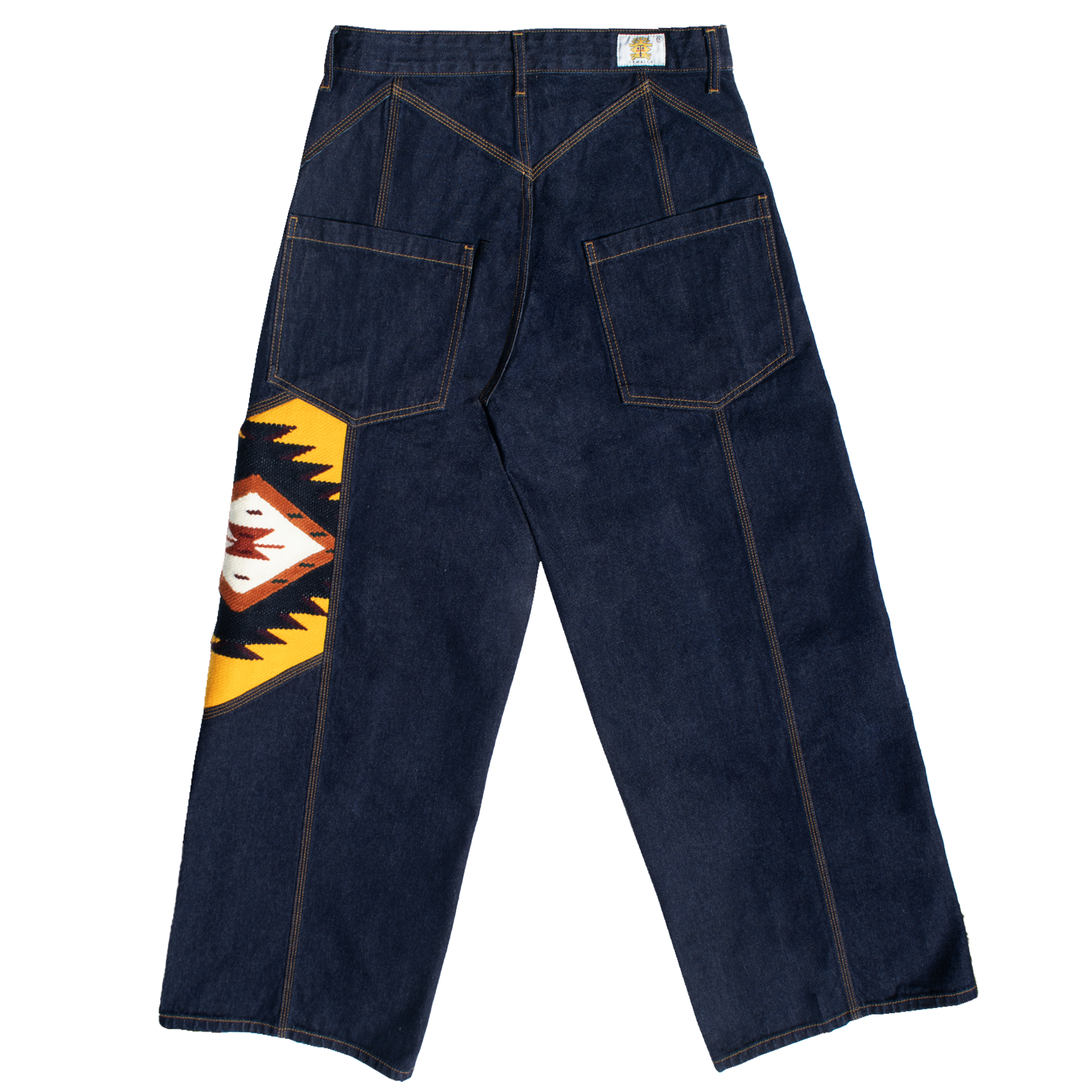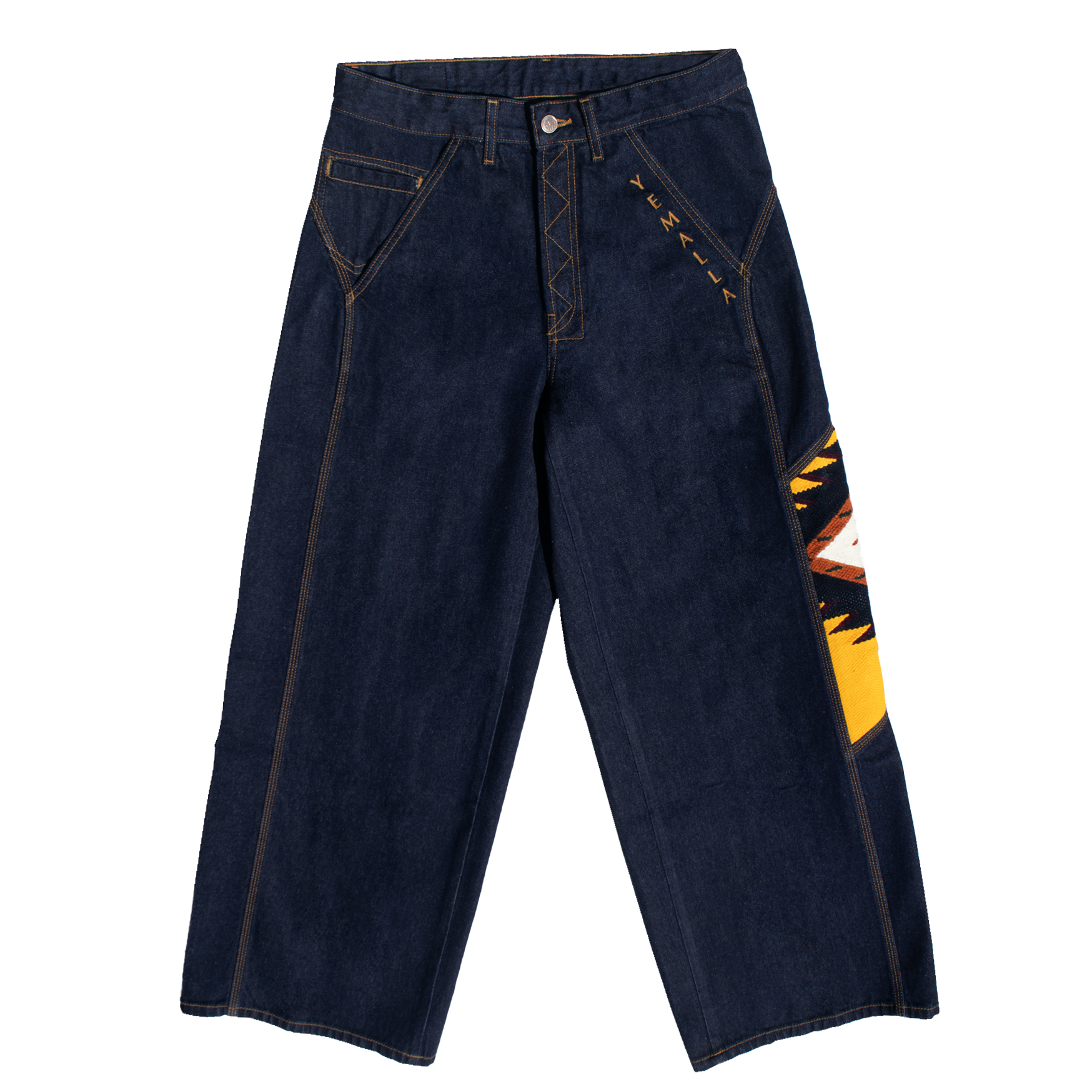 Oversize, unisex denim trousers. Dark wash. Geometrico trigo motif.