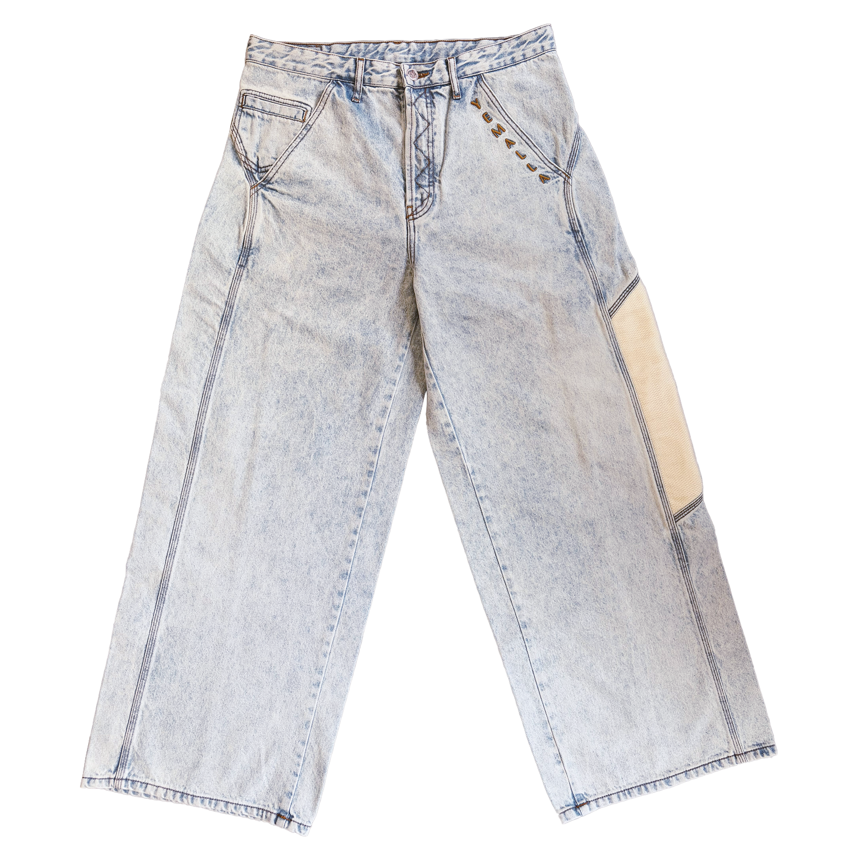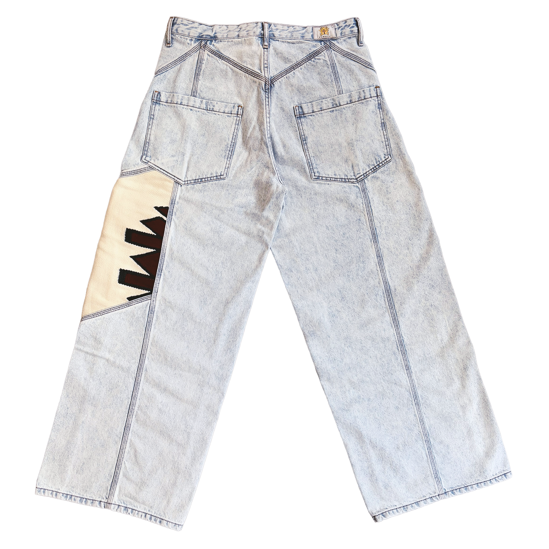Oversize, unisex denim trousers. Fragmentos cabeza motif.