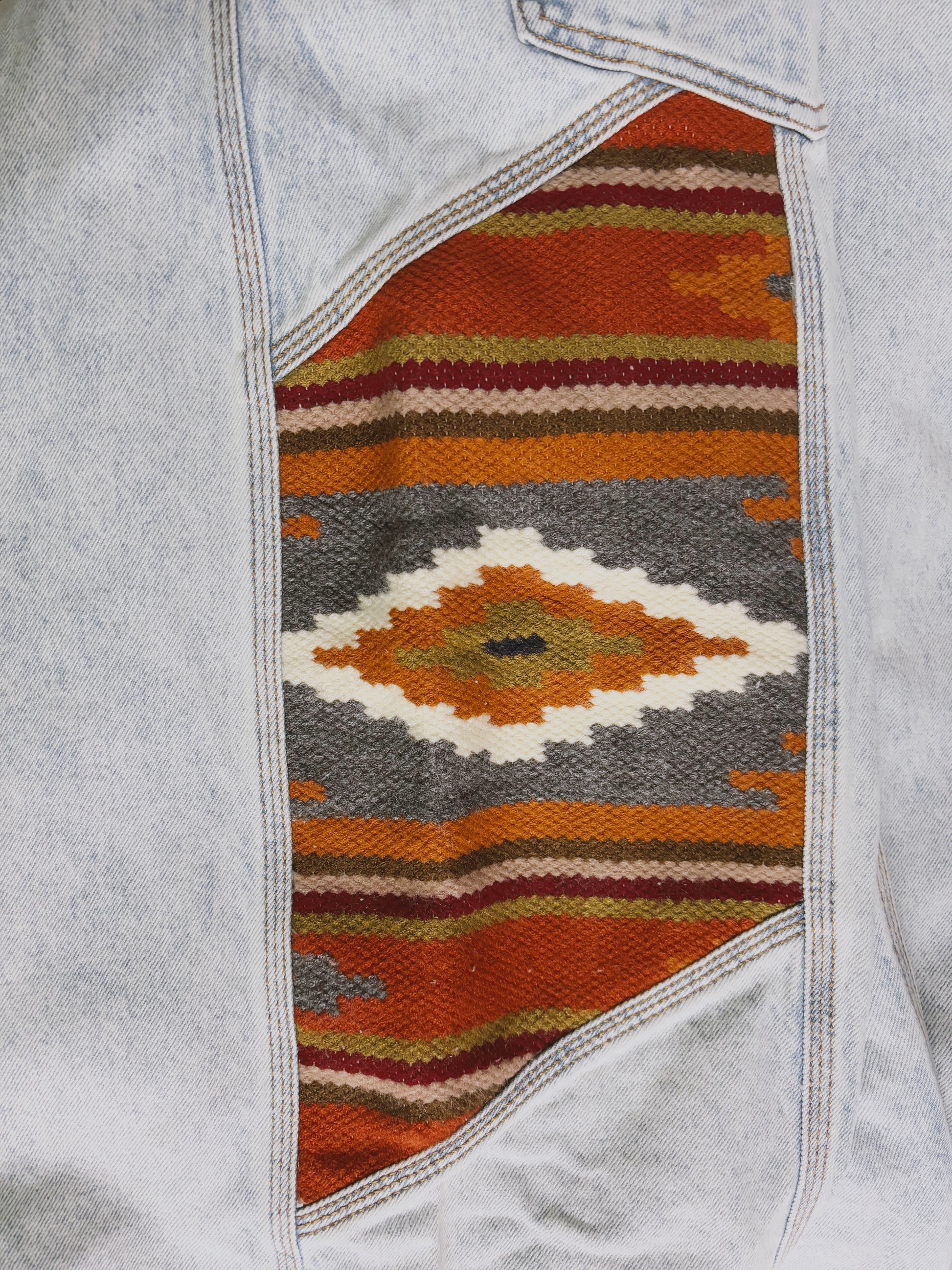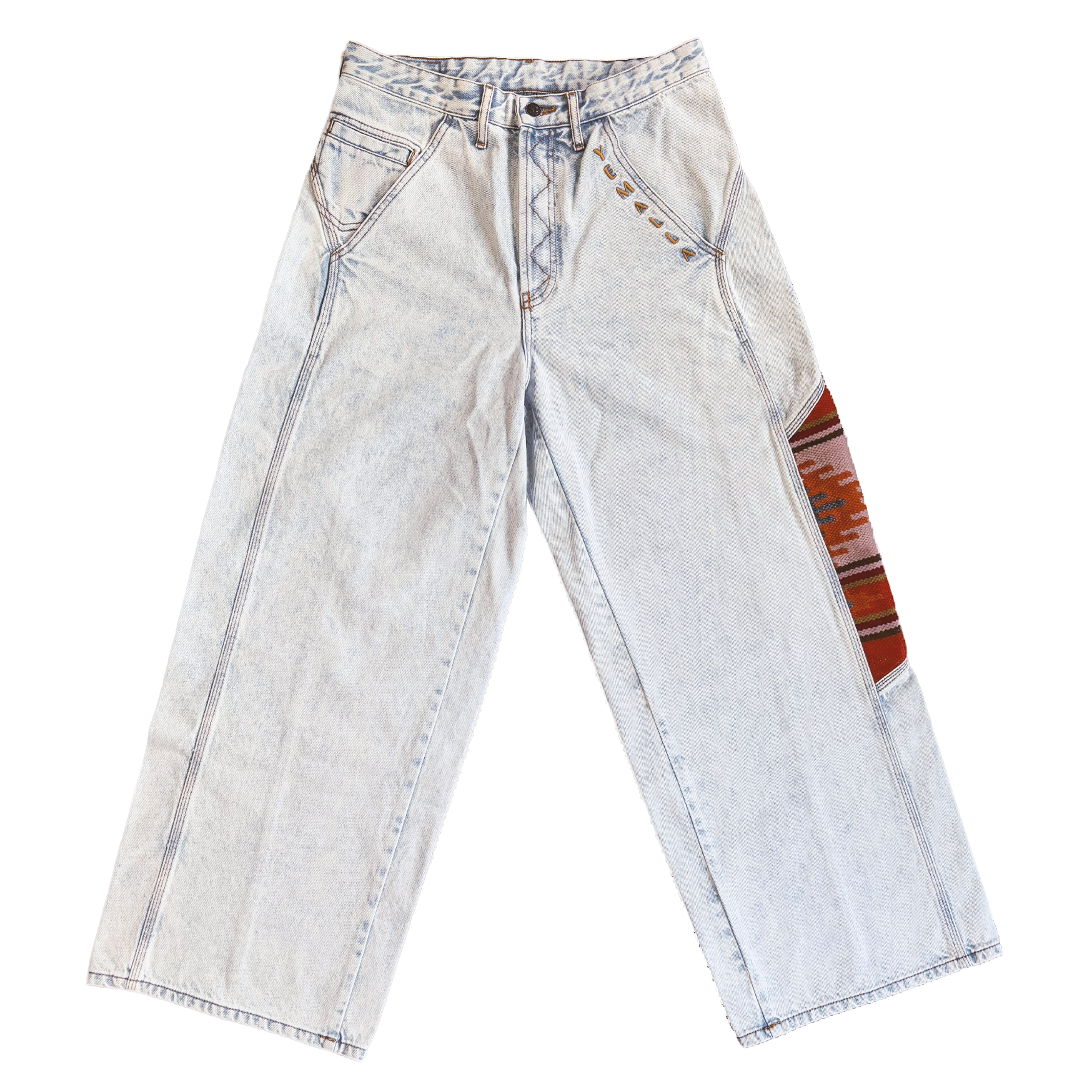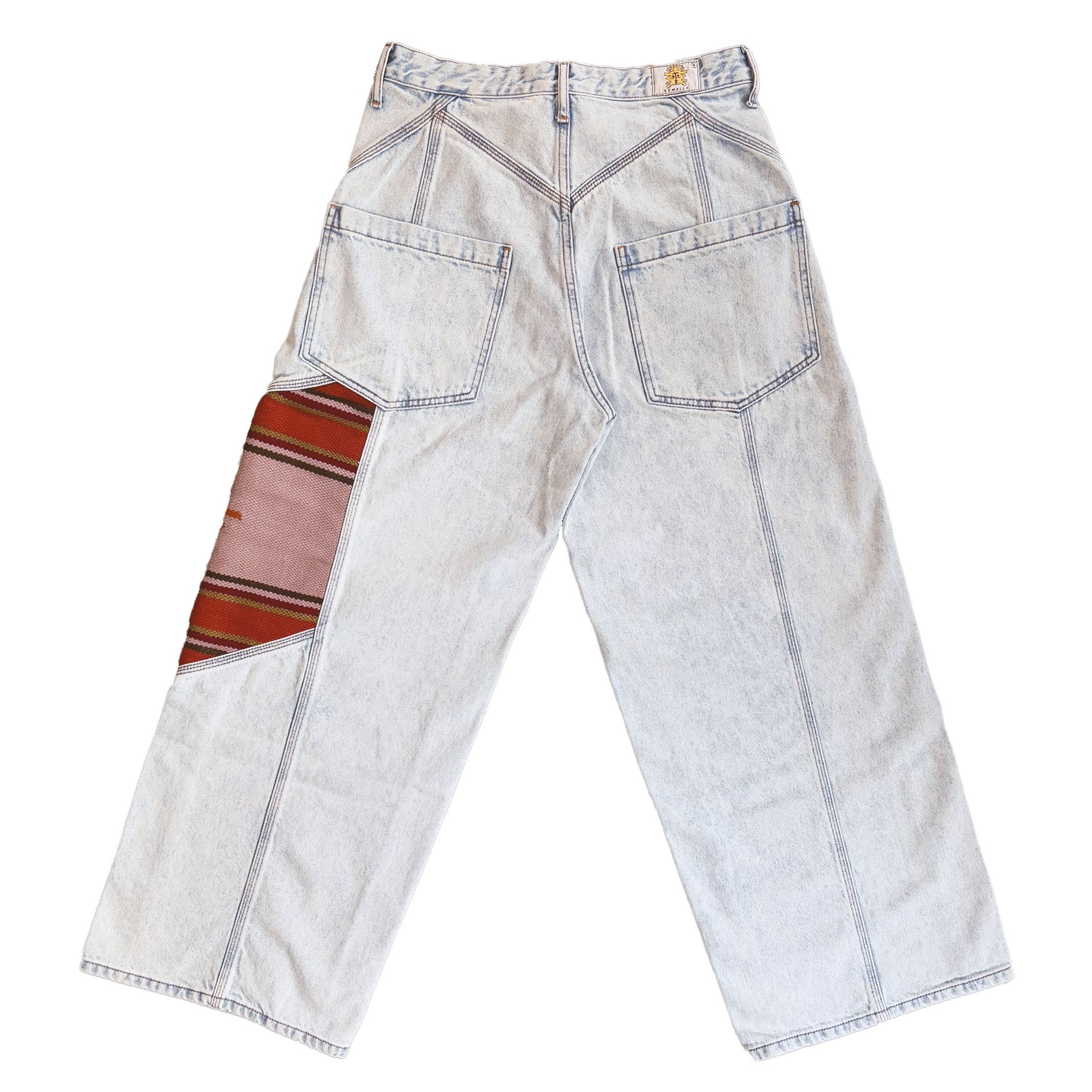 Oversize, unisex denim trousers. Geometrico Naranja motif.