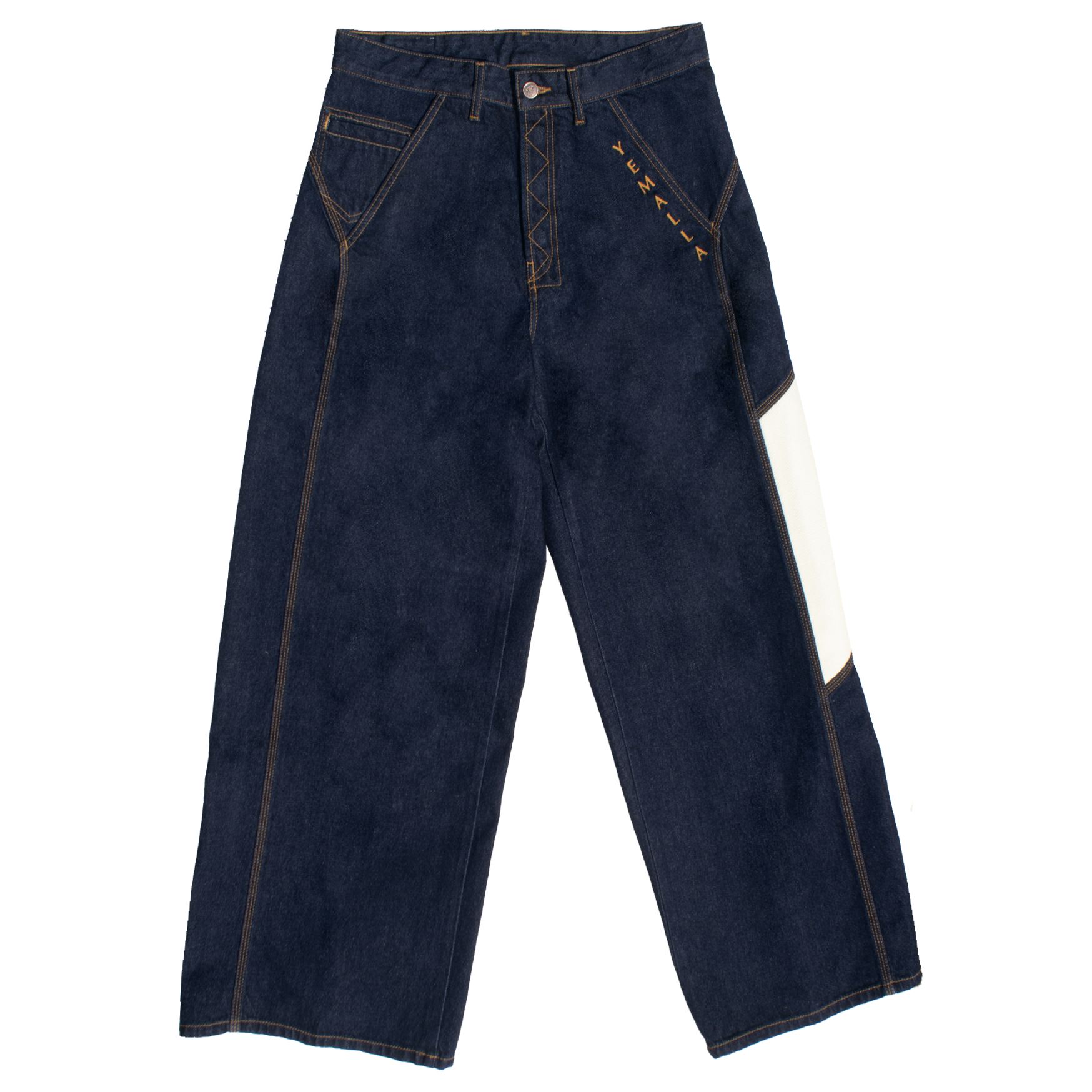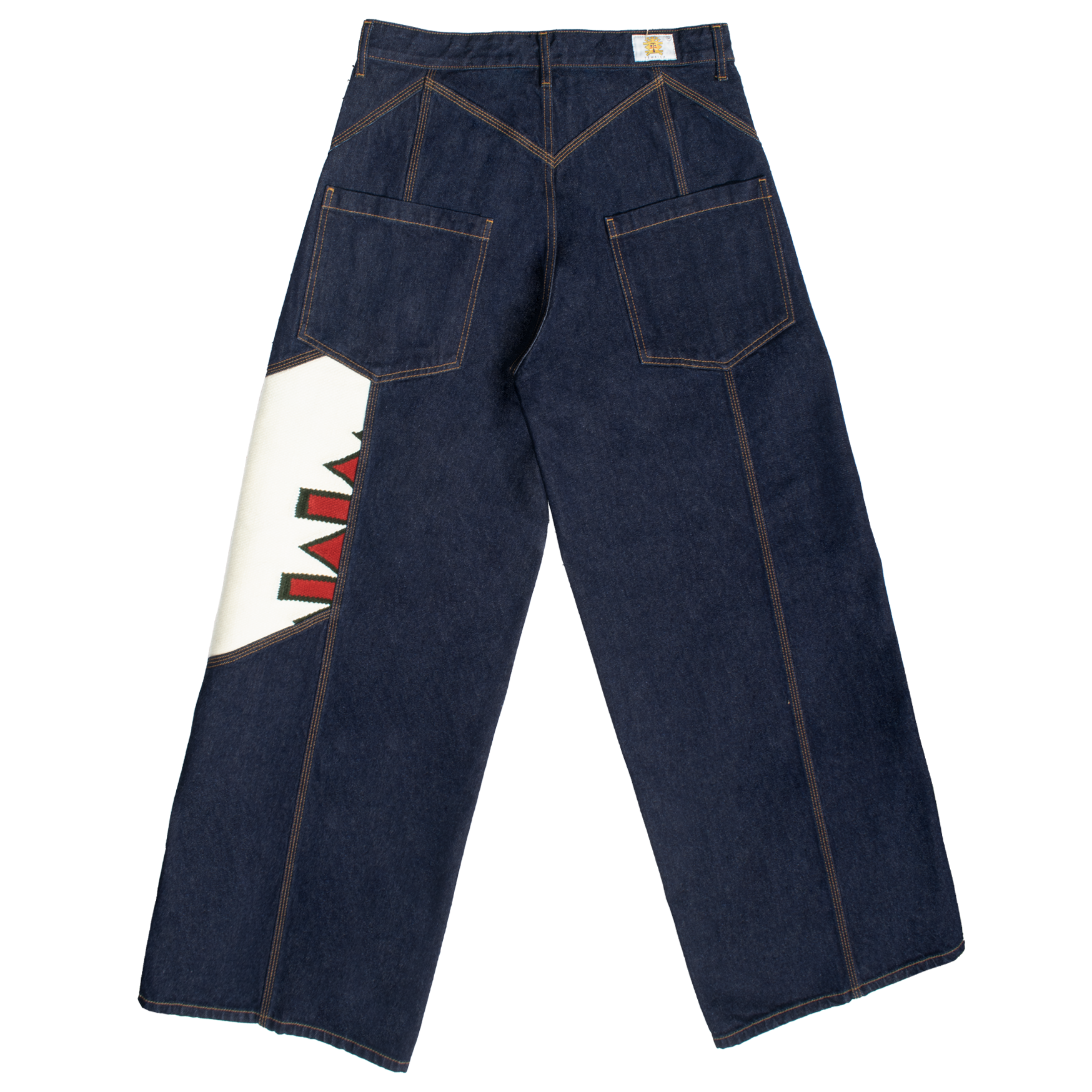 Oversize, unisex denim trousers. Dark wash. Fragmentos cabeza motif.