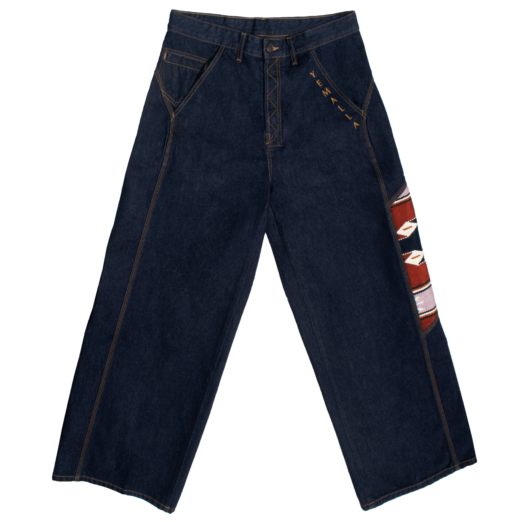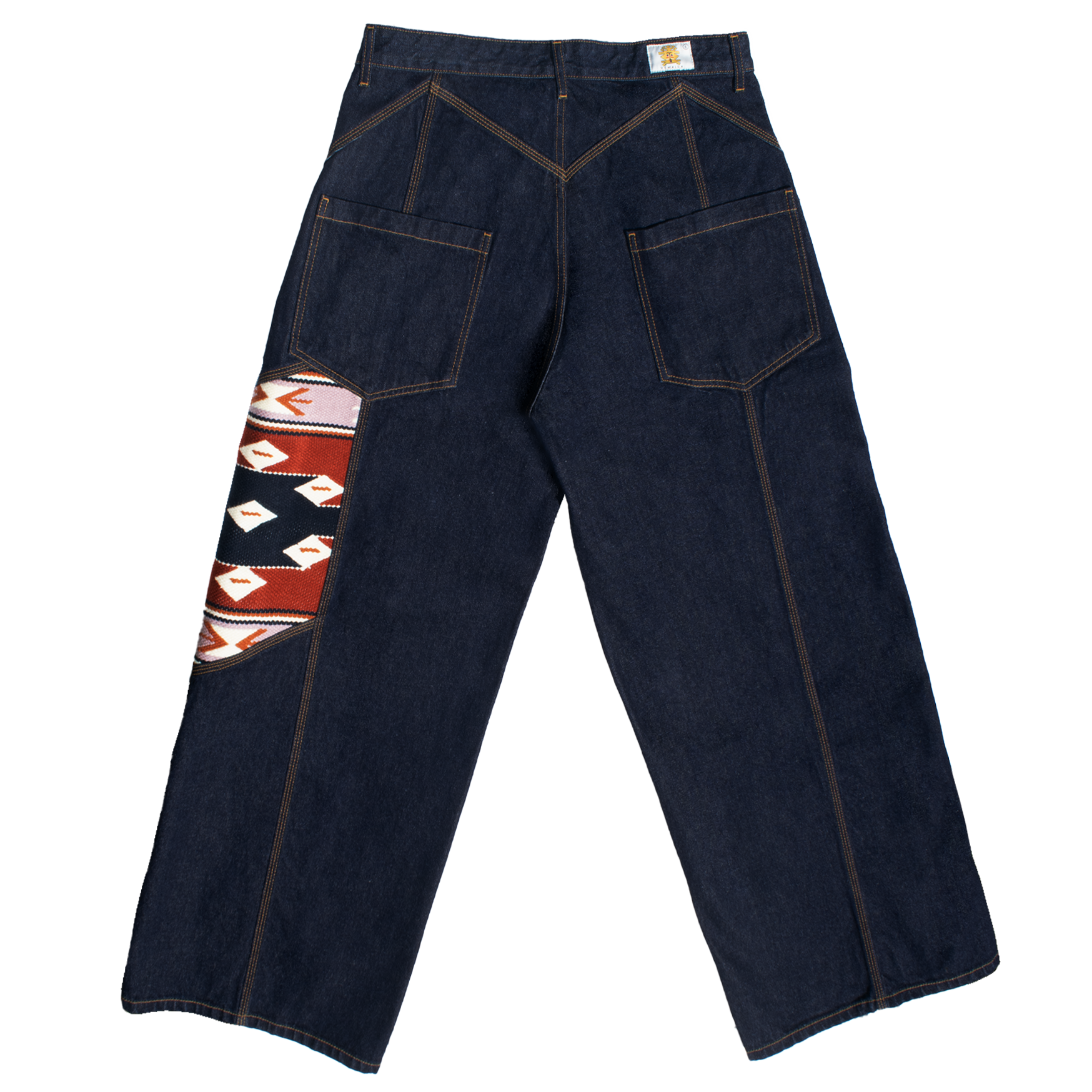 Oversize, unisex denim trousers. Dark wash. Geometrico rombo motif.
